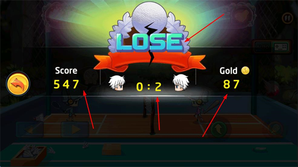 4、失敗后看得分與金幣,金幣用于解鎖角色或道具,復盤失分點,調整移動、擊球策略再戰。