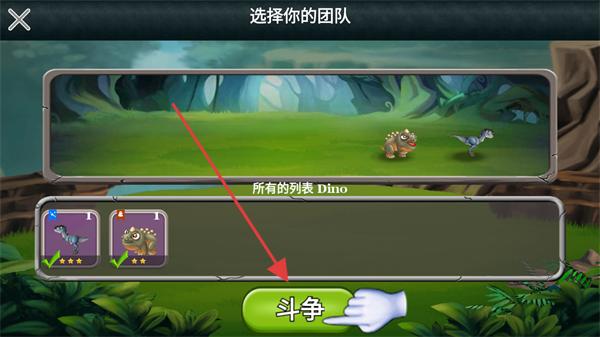 1、在團隊選擇界面,選定可用的恐龍成員組成團隊,點擊下方的按鈕進入戰斗環節,開啟對戰流程。