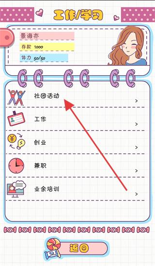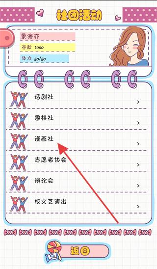 2、進入社團活動界面后,選擇漫畫社選項,可參與該社團的活動,提升對應的能力屬性。