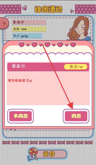 3、選擇漫畫社后,點擊同意按鈕參與活動,將消耗對應體力,同時增加繪畫能力。