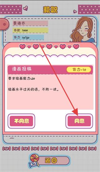 4、在兼職界面選擇漫畫投稿,該任務要求擁有一定繪畫能力,點擊同意可參與投稿,成功投稿也能提高一定繪畫屬性。