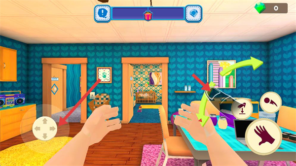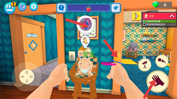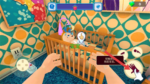 1、通過左側虛擬搖桿控制角色移動,在房間場景中切換區域,按任務指引完成照顧寶寶的操作。