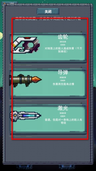 2、升級后會出現武器選擇界面,可挑選齒輪導彈激光等武器,不同武器有不同效果,選適合的能更好應對后續的怪物進攻。