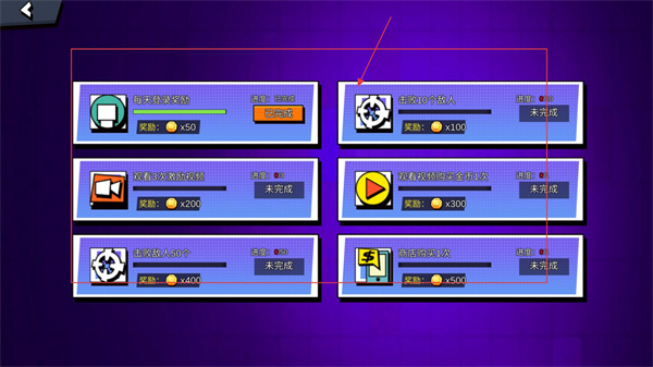 1、玩家進入任務界面包含每日登錄、擊敗敵人等多種任務,完成后可獲得金幣獎勵,需優先完成低門檻任務快速積累資源。