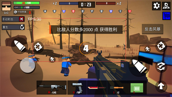 3、對戰勝利條件為比敵人分數多2000點,界面顯示生命值、彈藥量等狀態,需通過擊敗敵方單位、占領據點等方式積累分數。