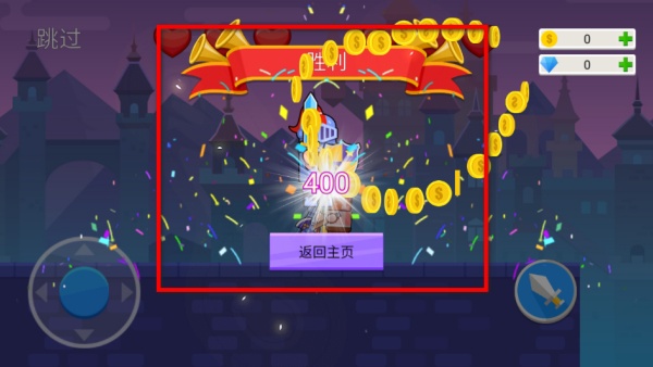 4、戰斗勝利后會獲得金幣獎勵,點擊返回主頁按鈕可回到主界面,后續可使用金幣解鎖更多內容提升角色能力。