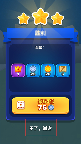 4、在勝利界面點擊不了,謝謝,關閉獎勵翻倍的彈窗,直接領取當前顯示的關卡通關獎勵。