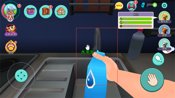 1、在廚房場景中選擇喂水選項,切換到對應的互動環節,準備進行給狗狗喂水的操作。