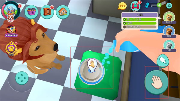 3、將裝有水的容器放到對應區域,點擊互動按鈕,向狗狗的水盆中注入清水,完成加水步驟。
