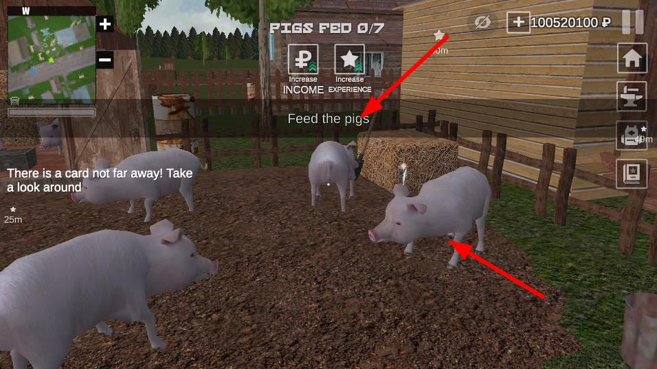 3、到養豬區域會出現Feedthepigs提示,需要給豬喂食,完成后能增加收入和經驗,同時留意附近卡片,繼續推進游戲。