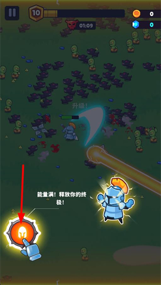 3、戰斗過程能量積滿后會提示能量滿釋放終極技能,點擊界面的對應按鈕,即可釋放終極技能,大范圍攻擊周圍的怪物。