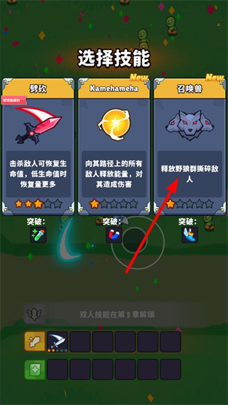 2、升級后會出現選擇技能界面,可從劈砍Kamehameha召喚獸里選一個技能,不同技能有不同效果,選后助力后續戰斗。