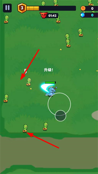 1、操控騎士角色,在草地上擊敗周圍的綠色怪物,戰斗過程會觸發升級提示,持續清理怪物推進游戲進度。