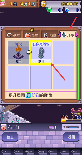 2、選中環境分類里的石像鬼雕像,查看其對應的功能說明,了解它能提升周圍單位的防御效果,確認該物品適配當前魔王城的需求,準備進行放置操作。