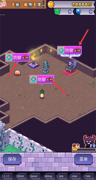 4、完成石像鬼雕像的放置后,觀察場景內的變化,會看到相關單位出現防御上升的提示,借助這類物品的效果,逐步強化魔王城的整體能力。