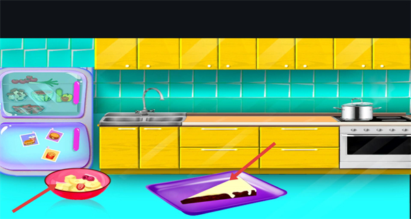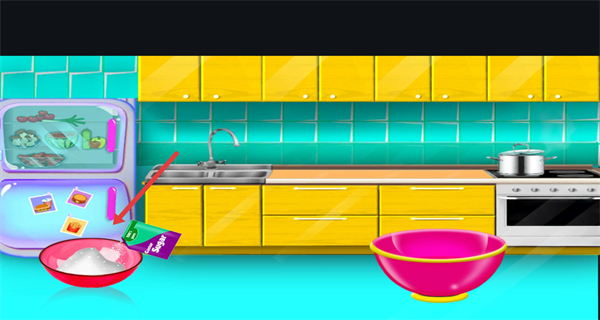 2、進入廚房場景后,需先獲取食材,比如界面中的糖等原料,按指引拾取這些食材并放入容器。