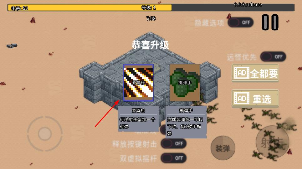 3、游戲中升級后彈出恭喜升級界面,展示雙管槍和擲彈手選項,選擇雙管槍獲取每次射擊增加射彈的技能。