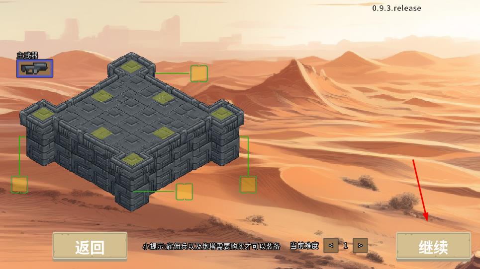 1、打開沙游戲后,進入布局頁面,顯示炮臺位置及點擊武器提示,底部設返回和繼續按鈕,選擇繼續進入準備環節。