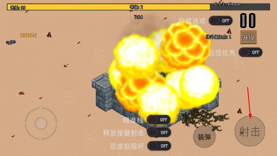 4、獲取技能后回到戰斗頁面,顯示擊殺數等級及待升級加點,點擊射擊按鈕釋放攻擊擊退敵方單位。