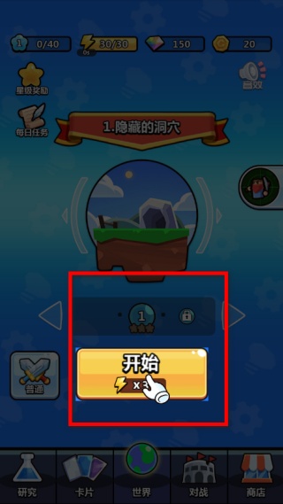 1、找到對應的關卡,點擊開始按鈕,消耗指定數量的閃電道具就能進入關卡,同時可以查看當前擁有的各類資源數量,為關卡挑戰做準備。
