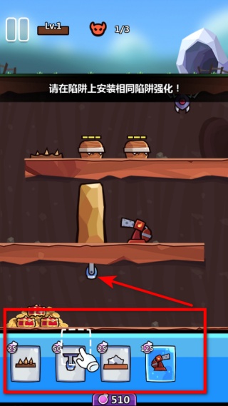 2、進入關卡后,按照提示從下方選擇相同類型的陷阱卡片,將其安裝到已布置的陷阱位置上,完成陷阱的強化操作,提升陷阱效果。
