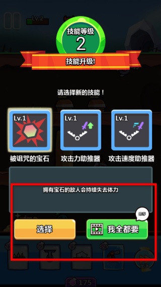4、技能升級時會出現技能選擇界面,從三個技能里選一個,比如被詛咒的寶石能讓敵人持續失去體力,選好后點擊選擇按鈕即可獲取該技能。