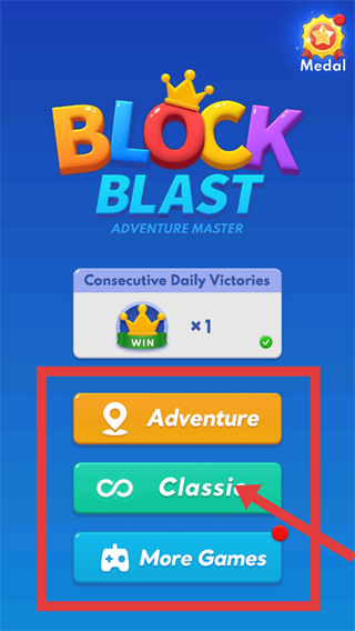 1、選擇Adventure或Classic等模式進入游戲,界面會顯示ConsecutiveDailyVictories等信息,根據需求點擊對應按鈕開啟方塊挑戰。