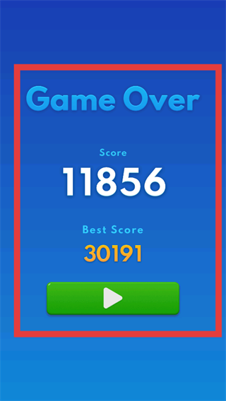 4、當游戲結束時會顯示GameOver,同時呈現Score和BestScore,點擊綠色按鈕可重新開始游戲,繼續參與方塊消除挑戰。