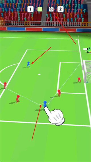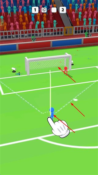2、游戲關卡過程內,拖動規劃藍色小人射門路線,避開紅色防守,嘗試直接進球。