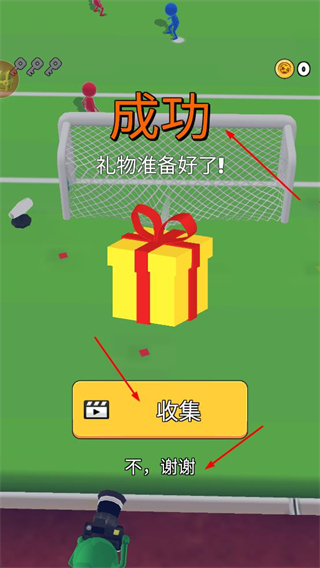 4、進球成功后,可以按照需要選擇收集看廣告領獎勵,或者點擊不,謝謝繼續挑戰。