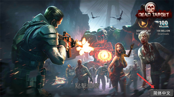 1、點擊界面中的點擊繼續按鈕,進入游戲的語言選擇界面,準備開啟僵尸末日的射擊戰斗流程。
