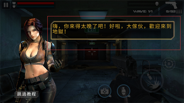 3、查看教程界面的對話內容,了解當前場景的背景信息,準備進入實際的僵尸射擊戰斗環節。