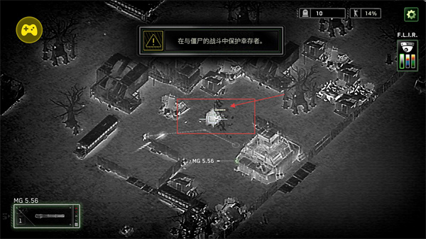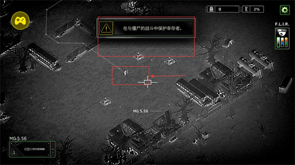 2、任務提示為在與僵尸的戰斗中保護幸存者,需定位幸存者位置,調整武器瞄準僵尸目標,優先消滅靠近幸存者的敵人。