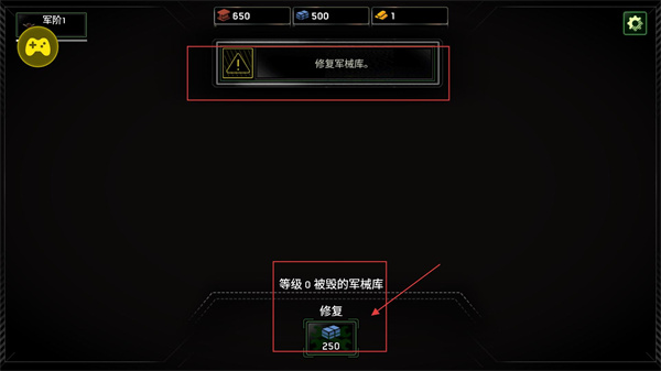 1、在軍階界面,點擊【修復】按鈕可修復破損的軍庫,修復需消耗250資源,軍庫修復后可解鎖存儲、資源生產等功能。