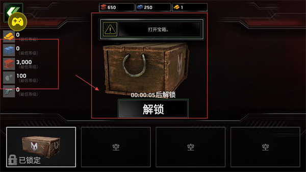 3、寶箱解鎖需等待倒計時結束,點擊【解鎖】按鈕可開啟寶箱,開啟后能獲得資源,這些資源可用于后續基地升級。