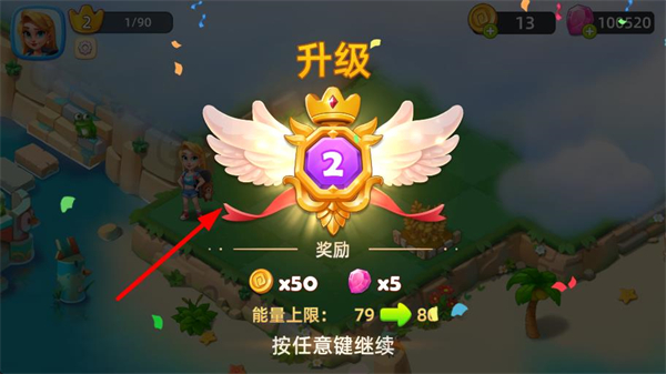 3、積累進度后會觸發升級界面,升級后能獲得貨幣和鉆石獎勵,同時能量上限也會提升,助力后續的游戲操作。