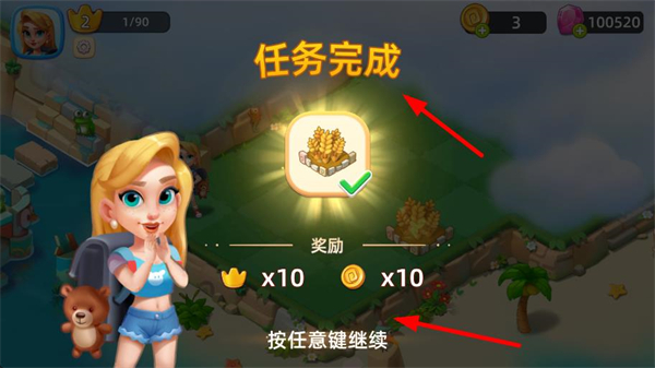 2、完成任務后會出現任務完成界面,界面顯示獎勵內容包括皇冠和貨幣,點擊按任意鍵繼續即可領取獎勵并繼續游戲。
