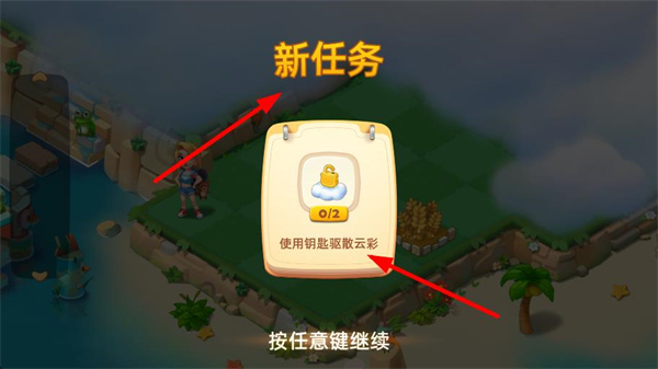 4、升級后會出現新任務界面,新任務要求使用鑰匙驅散云彩,按任意鍵繼續即可開啟新任務,推進游戲流程。