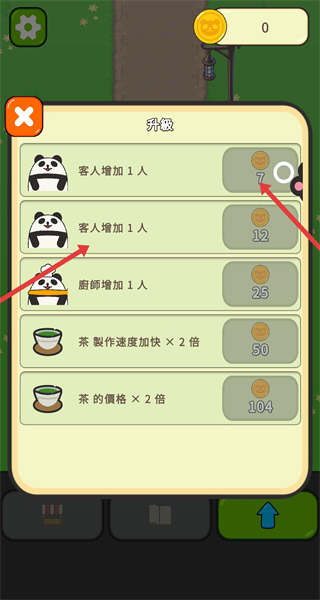 3、進入升級界面用金幣提升客人增加廚師增加等功能,可以優先選提升客流量或效率的選項。