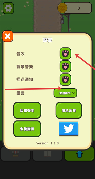 4、打開設置頁調整音效背景音樂開關,選語言為繁體中文,管理推送通知定制優化游戲體驗。