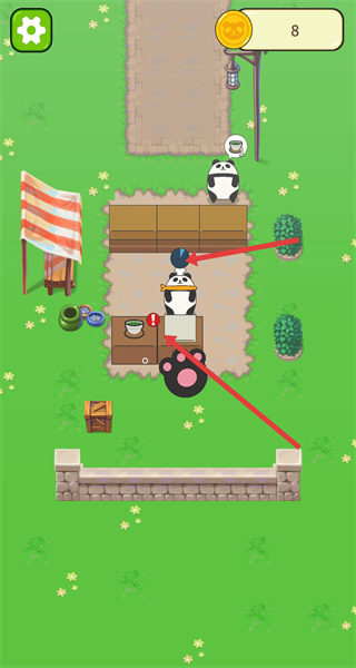 1、進入游戲場景操作熊貓角色按指引互動,比如給熊貓顧客送茶,能夠完成基礎經營流程。