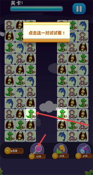 3、進入連連看關卡按提示點擊相同動物牌,連線不超兩個轉折消除,用底部道具助力完成關卡目標。