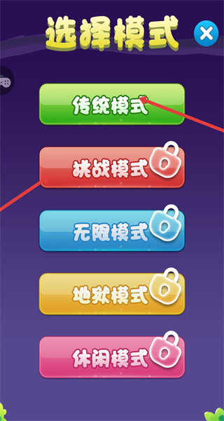 2、在選擇模式頁解鎖傳統模式先體驗,后續再開其他挑戰比如無限等模式按指引探索玩法差異。