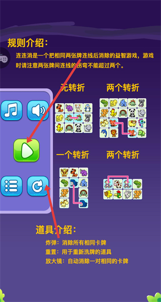4、查看規則介紹了解連連看玩法,熟悉炸彈重置等道具,點綠色按鈕開始游戲合理用道具通關。