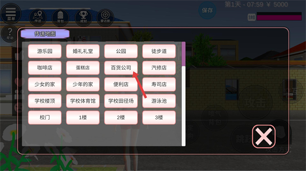3、傳送地圖界面里面有游樂園、百貨公司等多個地點選項,選擇對應地點即可快速傳送過去,節省移動時間,方便探索不同場景。