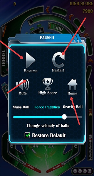 3、暫停時點Resume能夠繼續如果想重玩選Restart,調Mute關音效點Home可以返回到主界面。