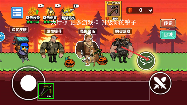 1、進入游戲主界面,可使用雙倍收益、雙倍傷害等增益道具,還能通過購買皮膚、屬性提升等功能強化角色,點擊對應按鈕啟動挖礦相關操作。