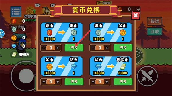 2、進入貨幣兌換頁面,可按比例兌換不同貨幣如銅幣換銀幣、銀幣換金幣,調整兌換數量后點擊購買,即可完成貨幣轉換,積累資源。
