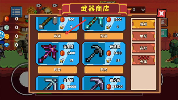 3、打開武器商店,可查看不同等級的鎬子如低級的基礎鎬,每個鎬子標注了所需資源,點擊購買即可獲取對應鎬子,提升挖礦效率。