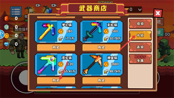 4、切換到中級武器分類,可查看夢幻鎬、彩虹鎬等中級鎬子,消耗對應資源點擊購買,獲取更強力的鎬子,進一步增強挖礦能力。